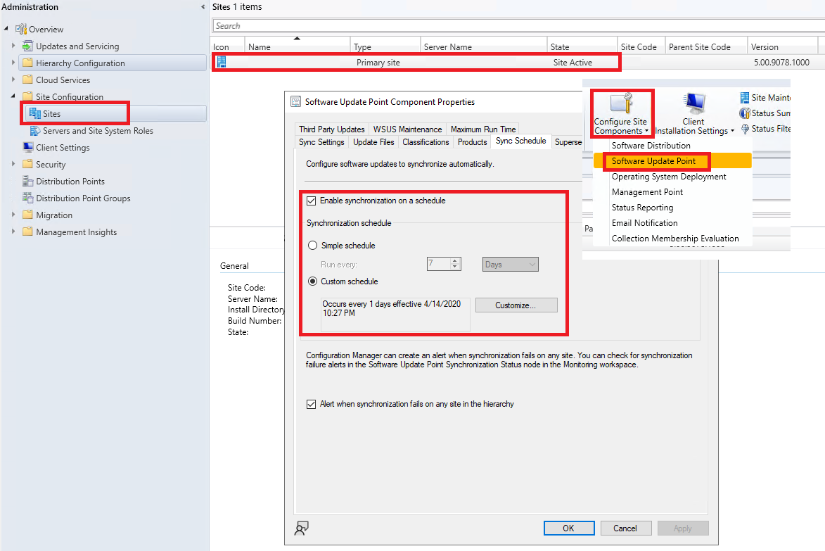 <figure><img src="https://48322287-files.gitbook.io/~/files/v0/b/gitbook-x-prod.appspot.com/o/spaces%2FcdUOS05wepzb10XGcGgw%2Fuploads%2FJhfZn58ymx385zWsxXJQ%2Fimage.png?alt=media&#x26;token=d9c7176d-bc61-4503-947a-378d86bbaa09" alt=""><figcaption><p>Synchronization Schedule in ConfigMgr (SCCM)</p></figcaption></figure>