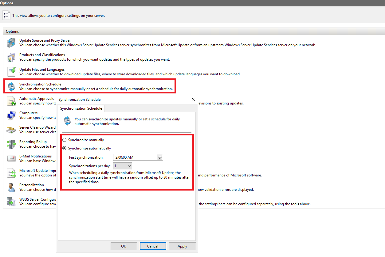 <figure><img src="https://48322287-files.gitbook.io/~/files/v0/b/gitbook-x-prod.appspot.com/o/spaces%2FcdUOS05wepzb10XGcGgw%2Fuploads%2FUGy3VjN8DKe1po9fTMIl%2Fimage.png?alt=media&#x26;token=2f8eed94-d476-437d-9406-1f61fbfd6e17" alt=""><figcaption><p>Synchronization Schedule in WSUS</p></figcaption></figure>
