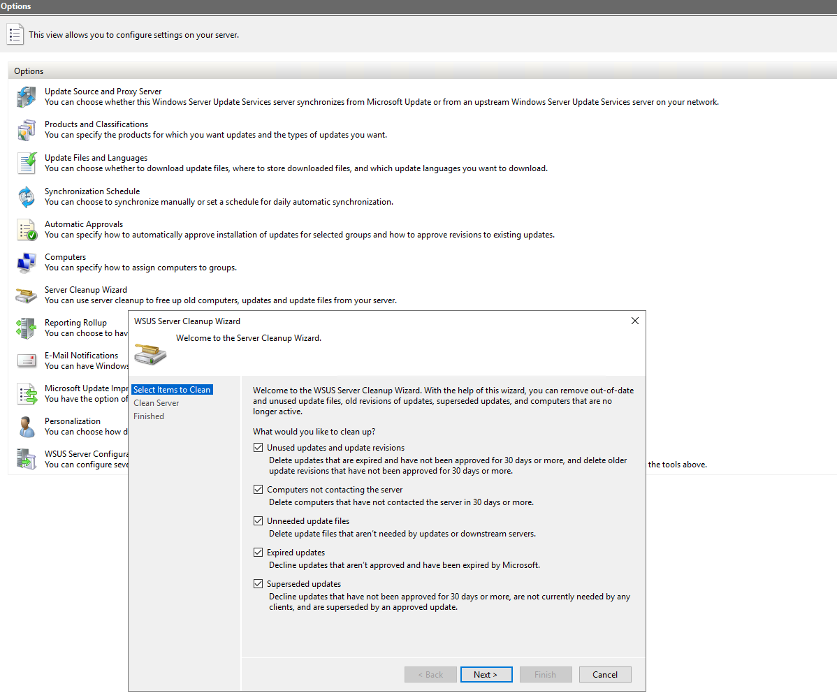 <figure><img src="https://48322287-files.gitbook.io/~/files/v0/b/gitbook-x-prod.appspot.com/o/spaces%2FcdUOS05wepzb10XGcGgw%2Fuploads%2FW8Z0M31T48fXvN2zKfxJ%2Fimage.png?alt=media&#x26;token=9da32987-6f39-435f-a299-33137867c32d" alt=""><figcaption><p>Cleanup Settings in WSUS</p></figcaption></figure>