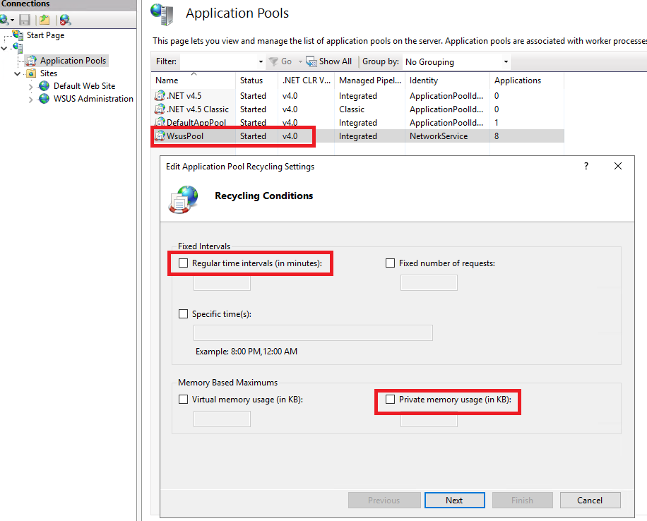 <figure><img src="https://48322287-files.gitbook.io/~/files/v0/b/gitbook-x-prod.appspot.com/o/spaces%2FcdUOS05wepzb10XGcGgw%2Fuploads%2FjBYzPmQhAYwThVwU7lYr%2Fimage.png?alt=media&#x26;token=af87a5de-227c-4aa6-8f68-c9a9c2a889f9" alt=""><figcaption><p>WSUS Application Pool - Recycling Options</p></figcaption></figure>